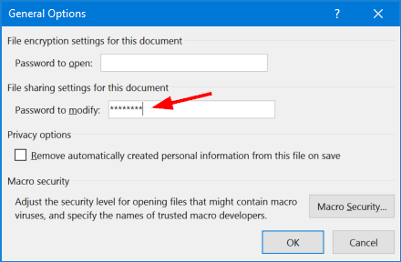 This opens the Save As dialog box. Click the Tools button on the bottom left, and choose General Options on the pop-up menu.