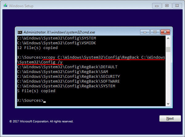 xcopy C:\Windows\System32\Config\RegBack C:\Windows\System32\Config /y