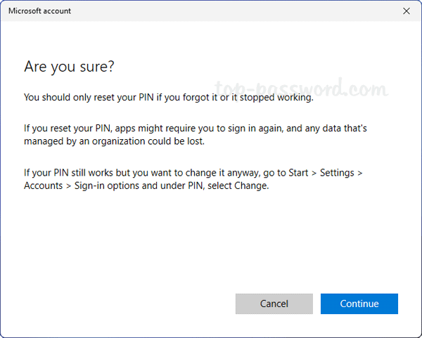 You will get a warning that you should only reset your PIN if you forgot it or it stopped working. click Continue to proceed with resetting your PIN.