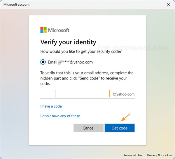You can receive the security code by email or phone number that is linked with your Microsoft account. If you choose the email option, enter the hidden part of your email address and click Get code.