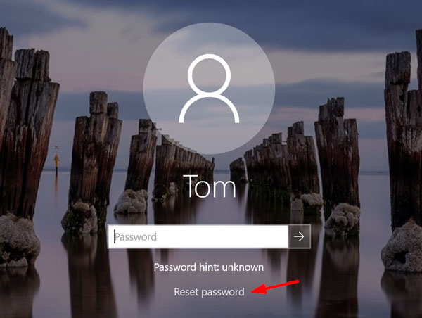 After a failure login attempt, Windows 10 will show a "Reset password" link just below the password box. Click or tap on it.