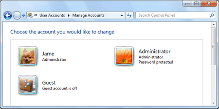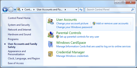 Go to Control Panel and click on the User Accounts and Family Safety, then click on User Accounts.
