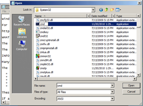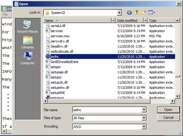 - In the File Open dialog box, change the Files of type option to All Files. Browse to the Sticky Keys application - C:\windows\system32\sethc.exe. Rename this file as a backup file: I named it "sethc-copy".