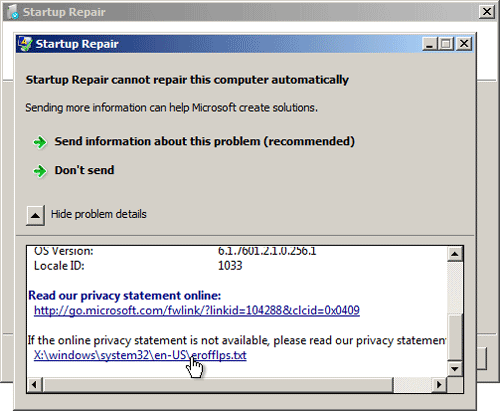 - The Startup Repair Tool begins analyzing startup log files for clues as to the source of the problem and then launches a series of diagnostic tests to determine the cause of the startup failure. After a long time, you will get a dialog saying that Startup Repair cannot repair this computer automatically! Click on View problem details.