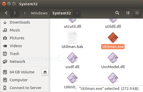 Once inside the desktop environment, open the File Manager and click on the drive where Windows is installed. Navigate to the directory \Windows\System32\ and first rename Utilman.exe to Utilman.bak, then make a copy of cmd.exe and call it Utilman.exe.