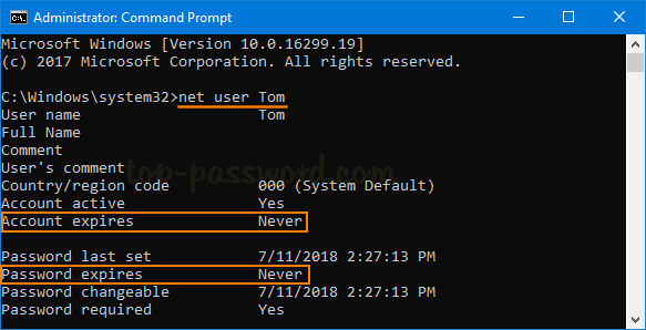 Now you can log into Windows with the new password you just set. At this point, open up the Command Prompt and you'll find out that both your account and password are already set to never expire.