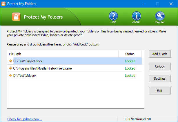 Protect My Folders is an innovative data security software which allows you to password protect any folders and files on your local computer. Make your important folders and files inaccessible, invisible or protect them from modification or deletion by unauthorized users. It's an ideal tool for you to lock / hide your private information from prying eyes.