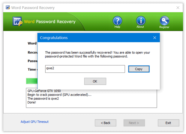 Word Password Recovery is the best Word password cracker to recover forgotten passwords for protected Word documents (*.doc, *.docx) created in Microsoft Office 2019, 2016, 2013, 2010, 2007, 2003, XP, 2000 and 97. Easily recover MS Word password using combination of Brute-force attack, Mask attack or Dictionary attack. Simply select your Word document (*.doc, *.docx) and wait for a few minutes while your password is recovered.